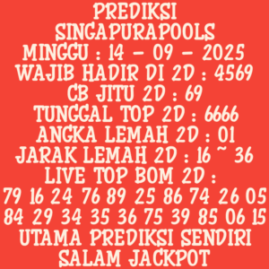 Prediksi Singapore Kamis, 09-10-2025 Merupakan Prediksi Otomatis yang menggabungkan Metode Kalender Togel Dengan LN Generator yang akurasi prediksinya sudah kita ketahui bersama. Jadi harap Maklum Jika kadang meleset Prediksi Singapore kita. Jadikan ini sebagai perbandingan saja dan tetap Utamakan karya sendiri