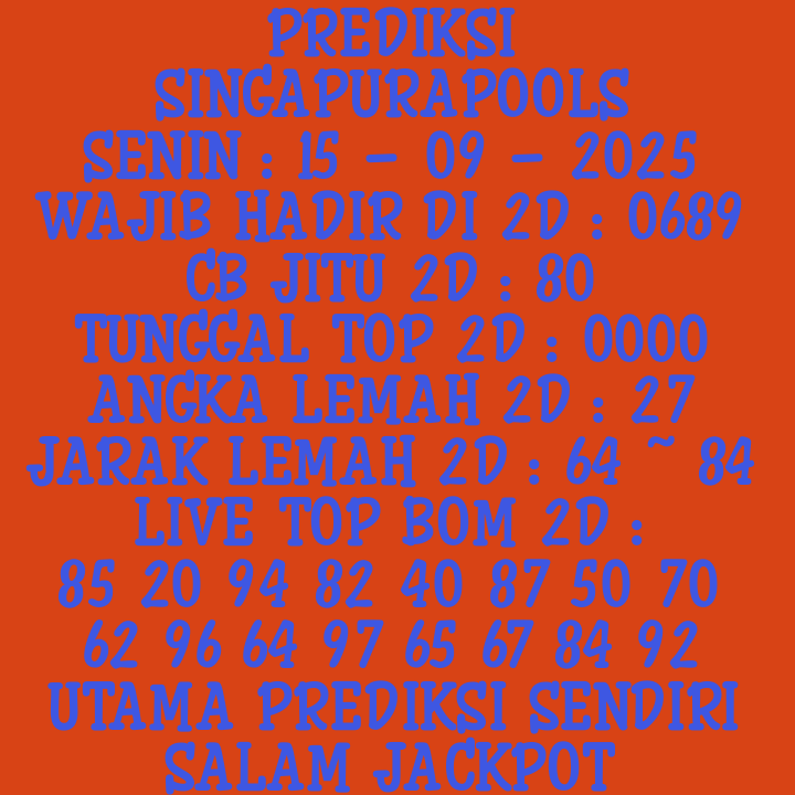 Prediksi Singapore Rabu, 08-10-2025 Merupakan Prediksi Otomatis yang menggabungkan Metode Kalender Togel Dengan LN Generator yang akurasi prediksinya sudah kita ketahui bersama. Jadi harap Maklum Jika kadang meleset Prediksi Singapore kita. Jadikan ini sebagai perbandingan saja dan tetap Utamakan karya sendiri