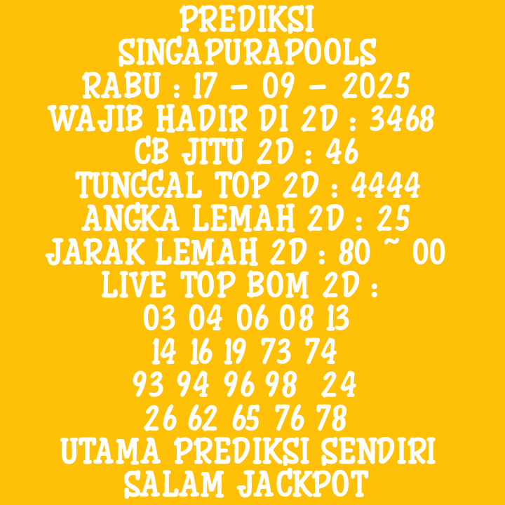 Prediksi Singapore Senin, 13-10-2025 Merupakan Prediksi Otomatis yang menggabungkan Metode Kalender Togel Dengan LN Generator yang akurasi prediksinya sudah kita ketahui bersama. Jadi harap Maklum Jika kadang meleset Prediksi Singapore kita. Jadikan ini sebagai perbandingan saja dan tetap Utamakan karya sendiri