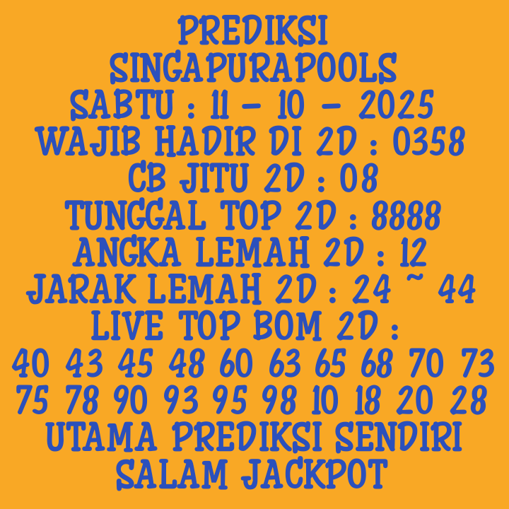 Prediksi Singapore Kamis, 06-11-2025 Merupakan Prediksi Otomatis yang menggabungkan Metode Kalender Togel Dengan LN Generator yang akurasi prediksinya sudah kita ketahui bersama. Jadi harap Maklum Jika kadang meleset Prediksi Singapore kita. Jadikan ini sebagai perbandingan saja dan tetap Utamakan karya sendiri