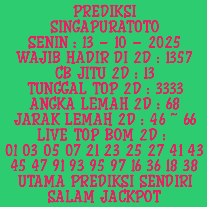 Prediksi Singapore Minggu, 02-11-2025 Merupakan Prediksi Otomatis yang menggabungkan Metode Kalender Togel Dengan LN Generator yang akurasi prediksinya sudah kita ketahui bersama. Jadi harap Maklum Jika kadang meleset Prediksi Singapore kita. Jadikan ini sebagai perbandingan saja dan tetap Utamakan karya sendiri