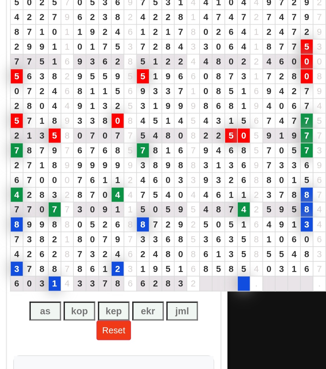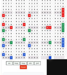 | Rumus Angka Mati berdasarkan kepala harian | 04 05 06 07 09 10 15 17 18 20 21 29 30 31 32 41 42 43 53 54 61 62 64 65 72 73 75 82 83 84 85 86 87 93 94 95 96 97 98 |