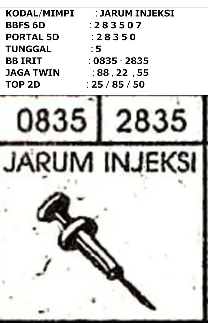 | Rumus Angka Mati berdasarkan kepala harian | 04 05 06 07 09 10 15 17 18 20 21 29 30 31 32 41 42 43 53 54 61 62 64 65 72 73 75 82 83 84 85 86 87 93 94 95 96 97 98 |