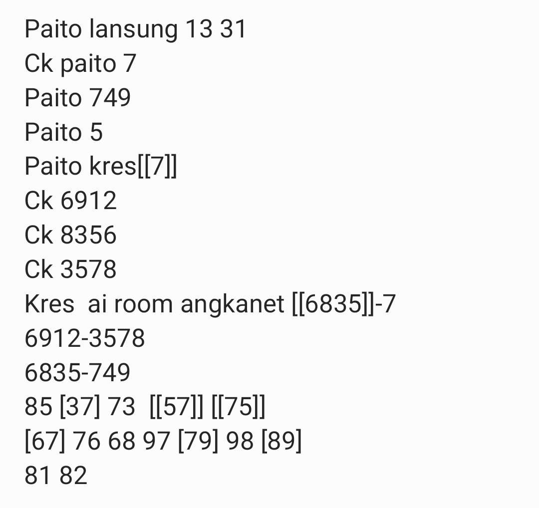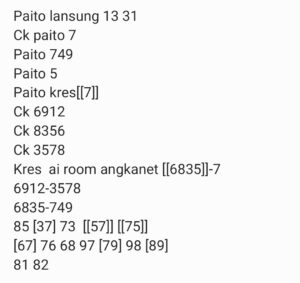 Prediksi Ini Berubah secara otomatis sesuai hari dan result pasaran masing-masing. Untuk melihat prediksi sebelumnya klik tombol nomor hitam diatas