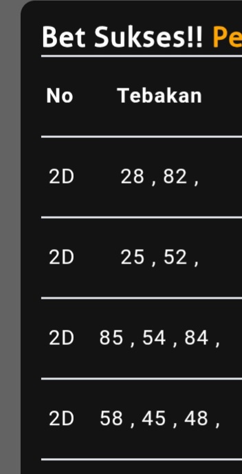 | Rumus Angka Mati berdasarkan kepala harian | 04 06 07 09 10 18 19 20 21 29 30 31 32 42 43 50 51 53 54 61 62 64 71 72 73 74 75 76 82 83 84 85 86 87 93 94 95 96 98 |
