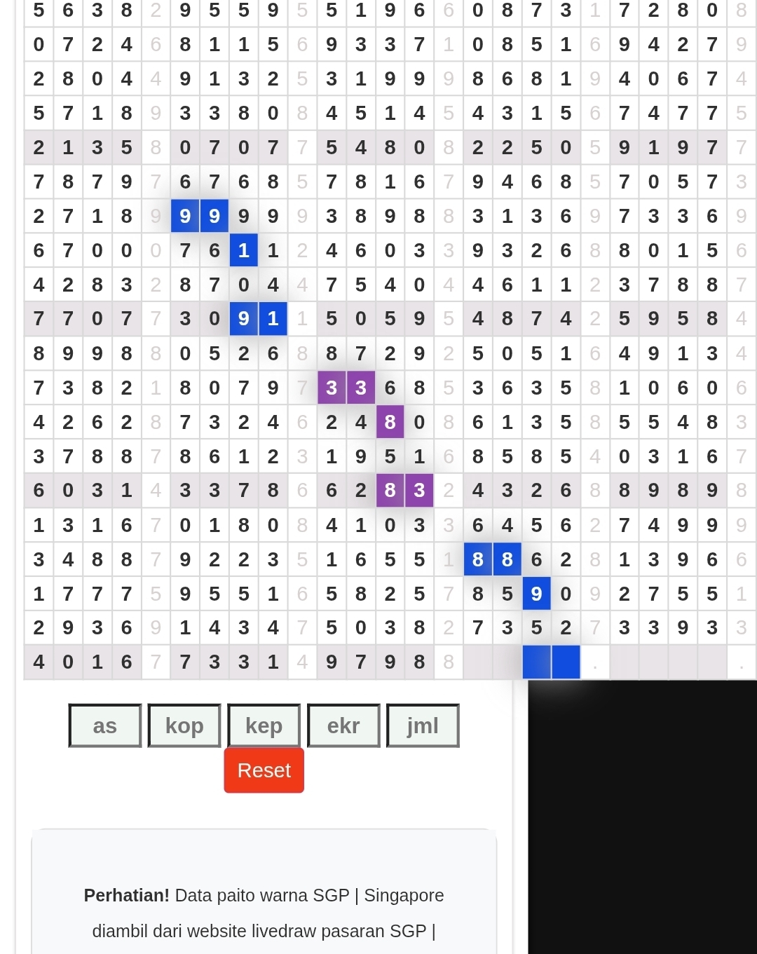 | Rumus Angka Mati berdasarkan kepala harian | 05 06 08 10 15 16 17 18 19 20 21 26 27 28 29 30 32 37 38 39 40 41 43 48 52 53 54 63 64 65 74 75 76 86 87 94 95 97 98 |