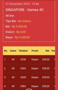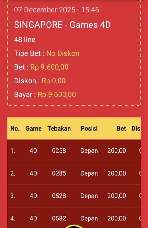 Prediksi Singapore Senin, 08-12-2025 Merupakan Prediksi Otomatis yang menggabungkan Metode Kalender Togel Dengan LN Generator yang akurasi prediksinya sudah kita ketahui bersama. Jadi harap Maklum Jika kadang meleset Prediksi Singapore kita. Jadikan ini sebagai perbandingan saja dan tetap Utamakan karya sendiri