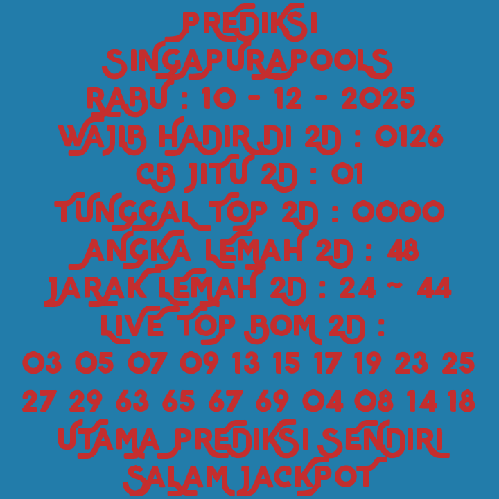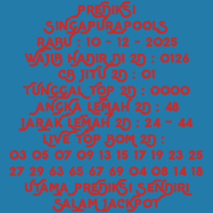 Prediksi Singapore Rabu, 10-12-2025 Merupakan Prediksi Otomatis yang menggabungkan Metode Kalender Togel Dengan LN Generator yang akurasi prediksinya sudah kita ketahui bersama. Jadi harap Maklum Jika kadang meleset Prediksi Singapore kita. Jadikan ini sebagai perbandingan saja dan tetap Utamakan karya sendiri