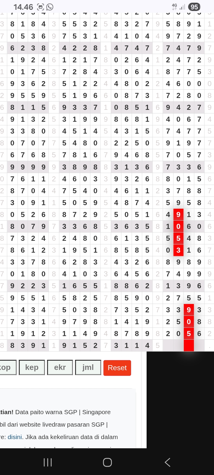 | Rumus Angka Mati berdasarkan kepala harian | 04 05 06 07 08 09 10 15 16 17 18 21 26 28 29 30 31 32 41 42 43 52 53 54 64 65 72 73 75 76 83 84 86 93 94 95 96 97 98 |