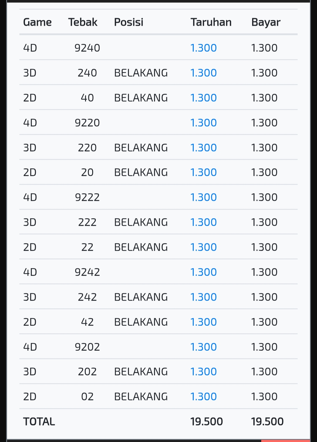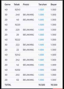 | Rumus Angka Mati berdasarkan kepala harian | 05 06 08 10 15 16 17 18 19 20 21 26 27 28 29 30 32 37 38 39 40 41 43 48 52 53 54 63 64 65 74 75 76 86 87 94 95 97 98 |