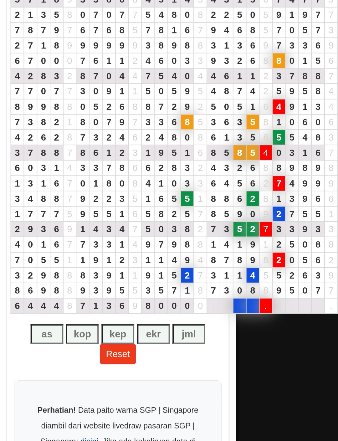| Rumus Angka Mati berdasarkan kepala harian | 07 08 09 10 19 20 21 27 28 31 38 39 40 41 42 43 48 49 50 51 52 53 54 59 60 61 62 63 65 71 73 74 76 85 86 87 96 97 98 |