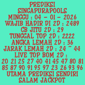 Prediksi Singapore Rabu, 07-01-2026 Merupakan Prediksi Otomatis yang menggabungkan Metode Kalender Togel Dengan LN Generator yang akurasi prediksinya sudah kita ketahui bersama. Jadi harap Maklum Jika kadang meleset Prediksi Singapore kita. Jadikan ini sebagai perbandingan saja dan tetap Utamakan karya sendiri