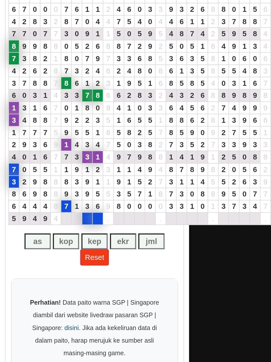 | Rumus Angka Mati berdasarkan kepala harian | 04 05 06 07 08 09 10 15 16 17 18 19 21 26 27 28 29 30 32 37 39 41 42 43 52 53 54 63 64 65 75 76 83 84 86 87 94 95 97 |