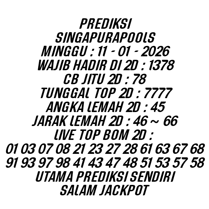 Prediksi Singapore Sabtu, 03-01-2026 Merupakan Prediksi Otomatis yang menggabungkan Metode Kalender Togel Dengan LN Generator yang akurasi prediksinya sudah kita ketahui bersama. Jadi harap Maklum Jika kadang meleset Prediksi Singapore kita. Jadikan ini sebagai perbandingan saja dan tetap Utamakan karya sendiri