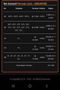 Prediksi Singapore Rabu, 22-10-2025 Merupakan Prediksi Otomatis yang menggabungkan Metode Kalender Togel Dengan LN Generator yang akurasi prediksinya sudah kita ketahui bersama. Jadi harap Maklum Jika kadang meleset Prediksi Singapore kita. Jadikan ini sebagai perbandingan saja dan tetap Utamakan karya sendiri