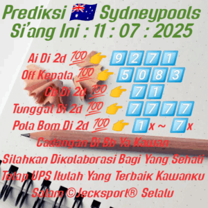 Prediksi Sydneypools Senin, 03-11-2025 Merupakan Prediksi Otomatis yang menggabungkan Metode Kalender Togel Dengan LN Generator yang akurasi prediksinya sudah kita ketahui bersama. Jadi harap Maklum Jika kadang meleset Prediksi Sydneypools kita. Jadikan ini sebagai perbandingan saja dan tetap Utamakan karya sendiri