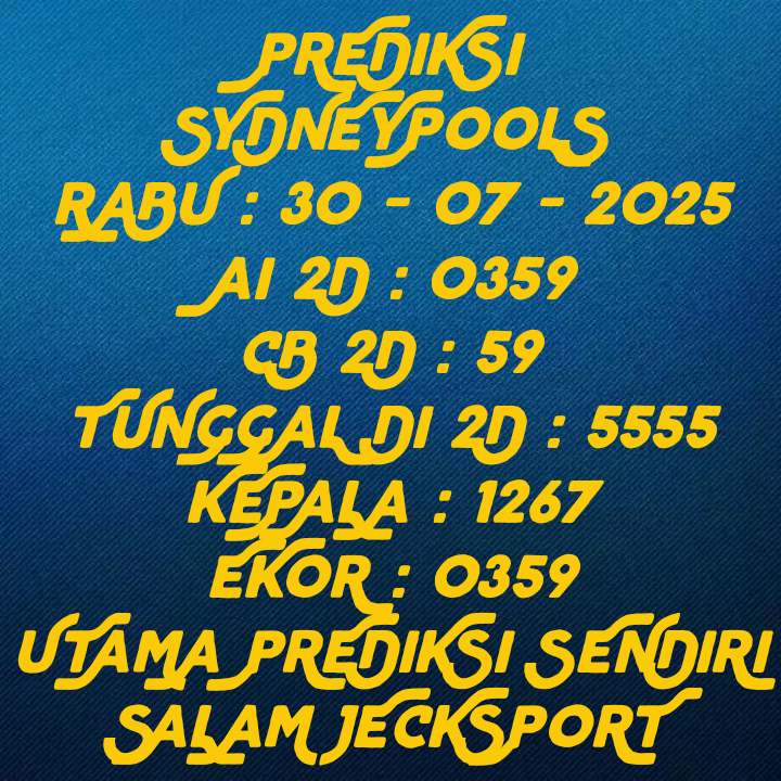 Prediksi Sydneypools Sabtu, 08-11-2025 Merupakan Prediksi Otomatis yang menggabungkan Metode Kalender Togel Dengan LN Generator yang akurasi prediksinya sudah kita ketahui bersama. Jadi harap Maklum Jika kadang meleset Prediksi Sydneypools kita. Jadikan ini sebagai perbandingan saja dan tetap Utamakan karya sendiri