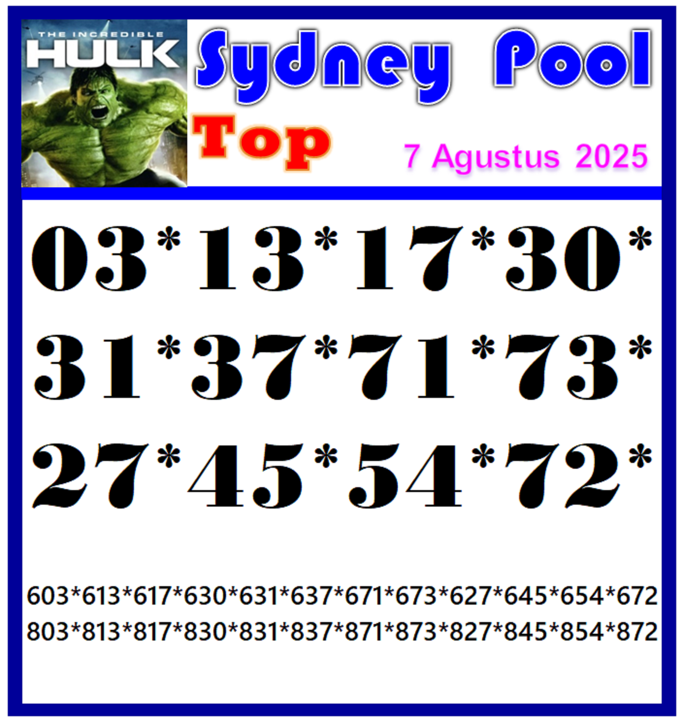 Prediksi Sydneypools Minggu, 26-10-2025 Merupakan Prediksi Otomatis yang menggabungkan Metode Kalender Togel Dengan LN Generator yang akurasi prediksinya sudah kita ketahui bersama. Jadi harap Maklum Jika kadang meleset Prediksi Sydneypools kita. Jadikan ini sebagai perbandingan saja dan tetap Utamakan karya sendiri