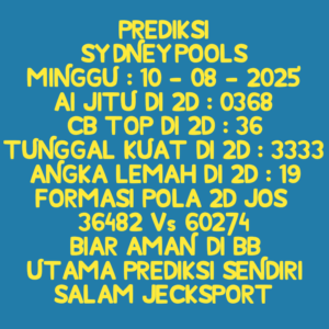 Prediksi Sydneypools Selasa, 14-10-2025 Merupakan Prediksi Otomatis yang menggabungkan Metode Kalender Togel Dengan LN Generator yang akurasi prediksinya sudah kita ketahui bersama. Jadi harap Maklum Jika kadang meleset Prediksi Sydneypools kita. Jadikan ini sebagai perbandingan saja dan tetap Utamakan karya sendiri