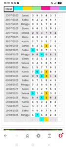 Prediksi Ini Berubah secara otomatis sesuai hari dan result pasaran masing-masing. Untuk melihat prediksi sebelumnya klik tombol nomor hitam diatas