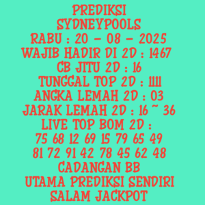 Prediksi Sydneypools Selasa, 04-11-2025 Merupakan Prediksi Otomatis yang menggabungkan Metode Kalender Togel Dengan LN Generator yang akurasi prediksinya sudah kita ketahui bersama. Jadi harap Maklum Jika kadang meleset Prediksi Sydneypools kita. Jadikan ini sebagai perbandingan saja dan tetap Utamakan karya sendiri