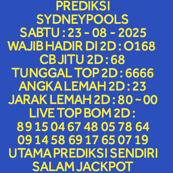 Selamat Bergabung kembali bersama angkanet dalam room Prediksi Sydneypools. Untuk kenyamanan dalam berprediksi, kami melarang adanya posting nomor WA, Web atau FB. Angkanet juga tidak pernah menjual prediksi, software, atau aplikasi togel lainnya. Berprediksilah secara damai dan elegan. Terima kasih telah menjadi pengunjung setia angkanet