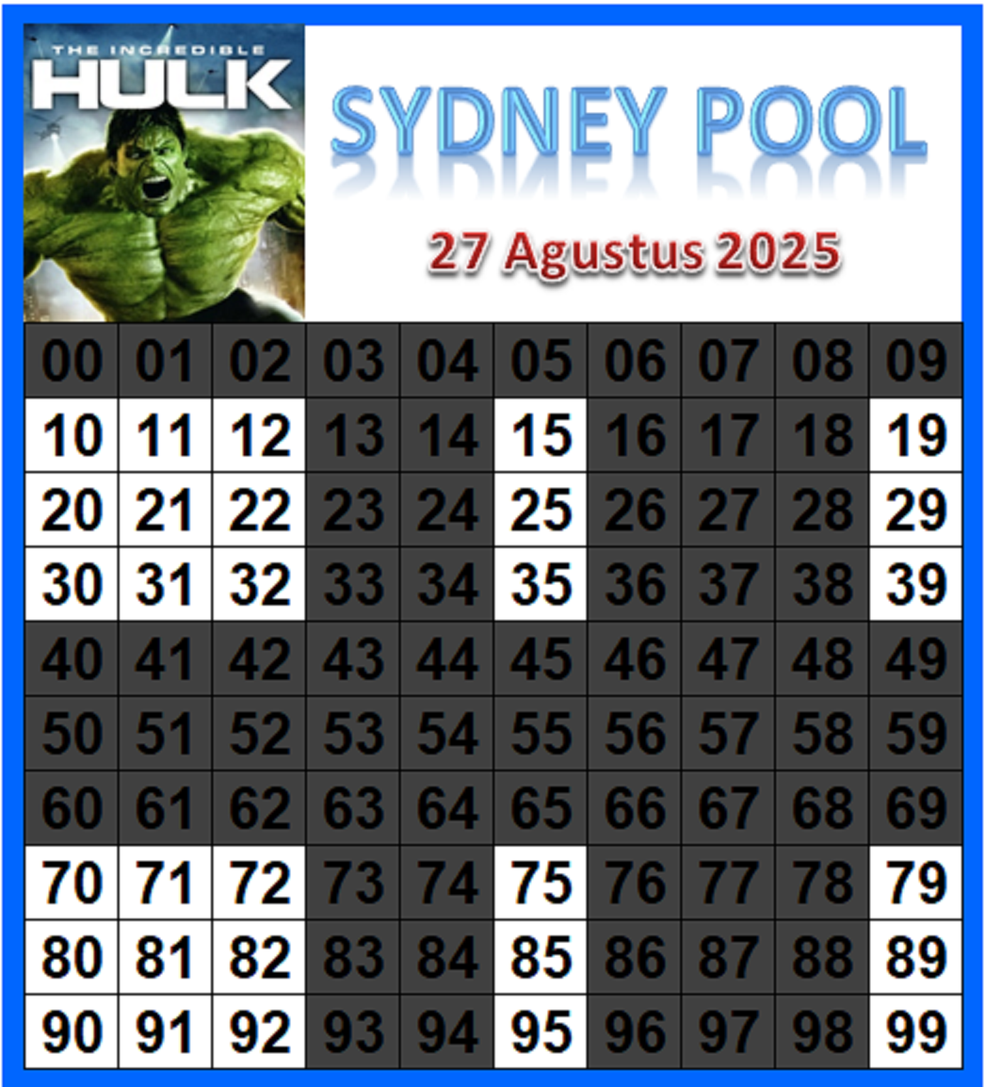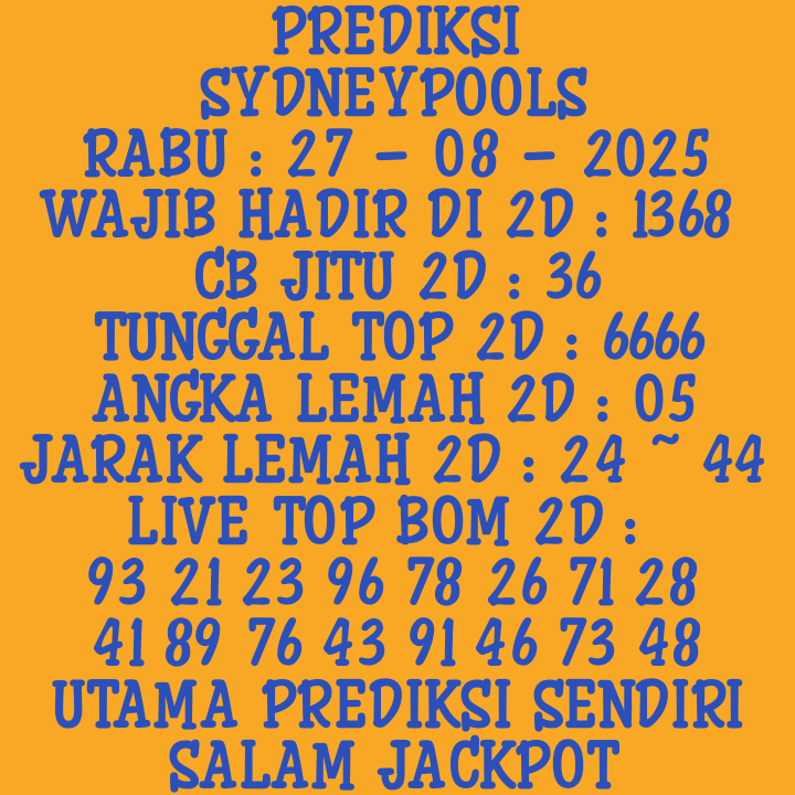 Prediksi Sydneypools Rabu, 05-11-2025 Merupakan Prediksi Otomatis yang menggabungkan Metode Kalender Togel Dengan LN Generator yang akurasi prediksinya sudah kita ketahui bersama. Jadi harap Maklum Jika kadang meleset Prediksi Sydneypools kita. Jadikan ini sebagai perbandingan saja dan tetap Utamakan karya sendiri