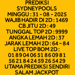 Prediksi Sydneypools Jumat, 17-10-2025 Merupakan Prediksi Otomatis yang menggabungkan Metode Kalender Togel Dengan LN Generator yang akurasi prediksinya sudah kita ketahui bersama. Jadi harap Maklum Jika kadang meleset Prediksi Sydneypools kita. Jadikan ini sebagai perbandingan saja dan tetap Utamakan karya sendiri