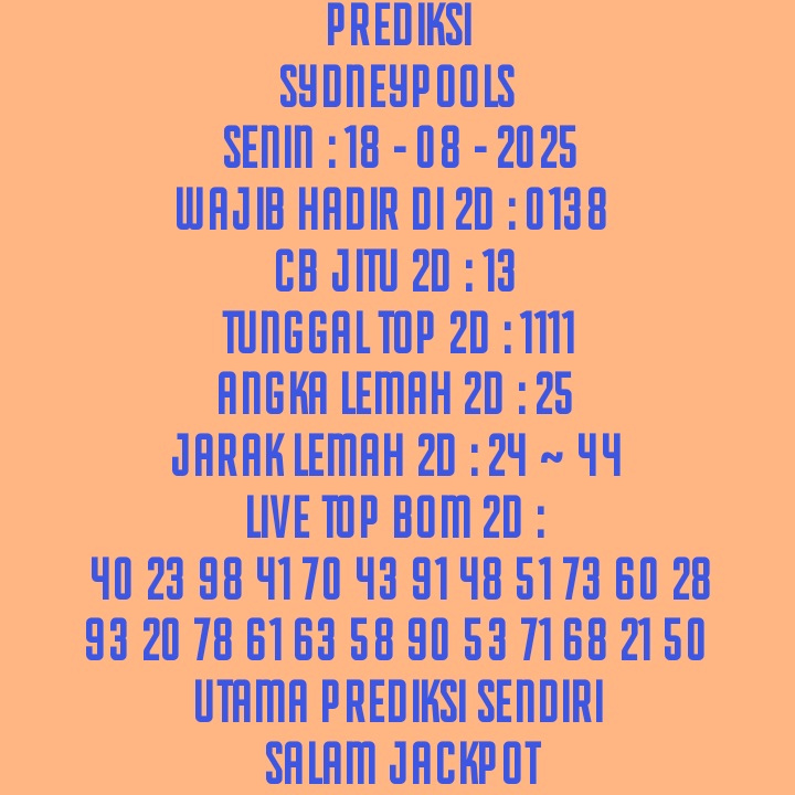 Prediksi Sydneypools Sabtu, 18-10-2025 Merupakan Prediksi Otomatis yang menggabungkan Metode Kalender Togel Dengan LN Generator yang akurasi prediksinya sudah kita ketahui bersama. Jadi harap Maklum Jika kadang meleset Prediksi Sydneypools kita. Jadikan ini sebagai perbandingan saja dan tetap Utamakan karya sendiri