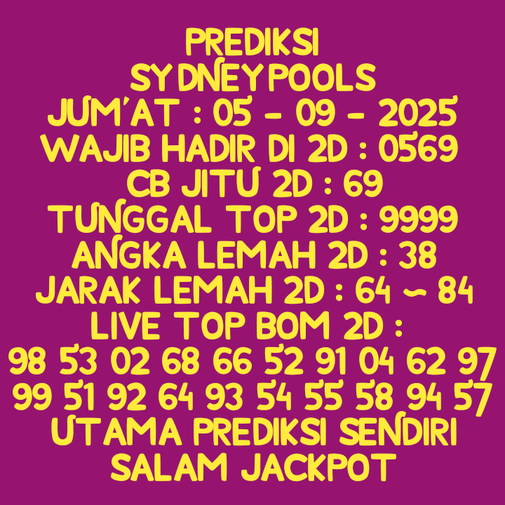 Prediksi Sydneypools Kamis, 16-10-2025 Merupakan Prediksi Otomatis yang menggabungkan Metode Kalender Togel Dengan LN Generator yang akurasi prediksinya sudah kita ketahui bersama. Jadi harap Maklum Jika kadang meleset Prediksi Sydneypools kita. Jadikan ini sebagai perbandingan saja dan tetap Utamakan karya sendiri