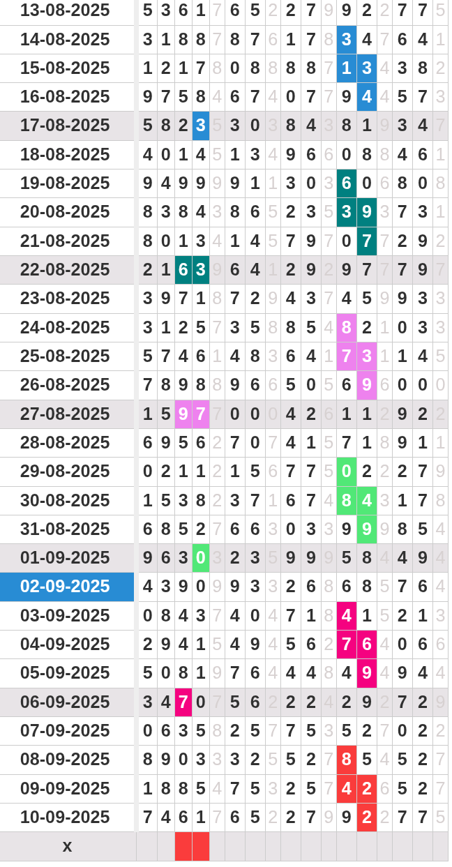 | Rumus Angka Mati berdasarkan kepala harian | 04 05 06 07 09 10 15 17 18 20 21 29 30 31 32 41 42 43 53 54 61 62 64 65 72 73 75 82 83 84 85 86 87 93 94 95 96 97 98 |
