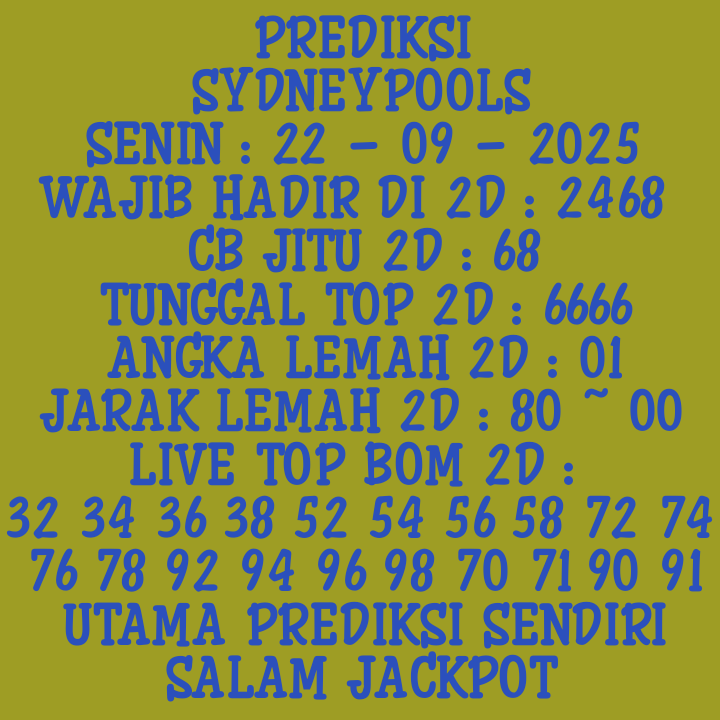 Prediksi Sydneypools Rabu, 05-11-2025 Merupakan Prediksi Otomatis yang menggabungkan Metode Kalender Togel Dengan LN Generator yang akurasi prediksinya sudah kita ketahui bersama. Jadi harap Maklum Jika kadang meleset Prediksi Sydneypools kita. Jadikan ini sebagai perbandingan saja dan tetap Utamakan karya sendiri