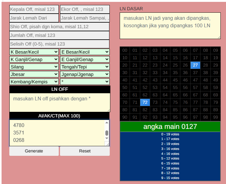 | Rumus Angka Mati berdasarkan kepala harian | 04 06 07 09 10 18 19 20 21 29 30 31 32 42 43 50 51 53 54 61 62 64 71 72 73 74 75 76 82 83 84 85 86 87 93 94 95 96 98 |