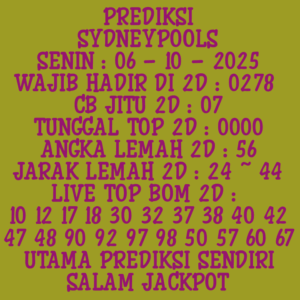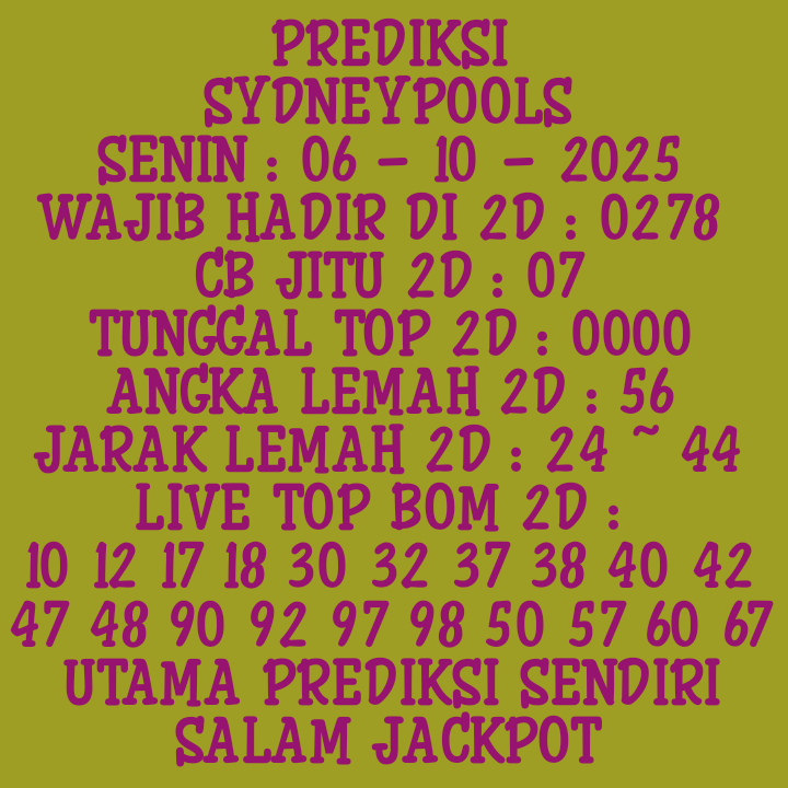 Prediksi Sydneypools Kamis, 09-10-2025 Merupakan Prediksi Otomatis yang menggabungkan Metode Kalender Togel Dengan LN Generator yang akurasi prediksinya sudah kita ketahui bersama. Jadi harap Maklum Jika kadang meleset Prediksi Sydneypools kita. Jadikan ini sebagai perbandingan saja dan tetap Utamakan karya sendiri