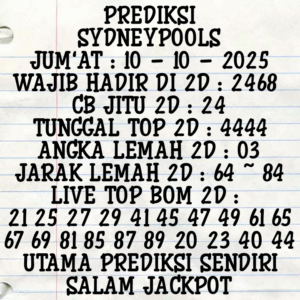 Prediksi Sydneypools Kamis, 06-11-2025 Merupakan Prediksi Otomatis yang menggabungkan Metode Kalender Togel Dengan LN Generator yang akurasi prediksinya sudah kita ketahui bersama. Jadi harap Maklum Jika kadang meleset Prediksi Sydneypools kita. Jadikan ini sebagai perbandingan saja dan tetap Utamakan karya sendiri