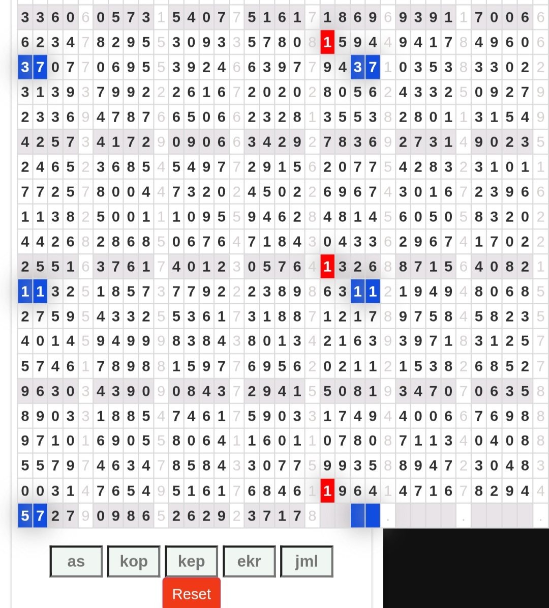 | Rumus Angka Mati berdasarkan kepala harian | 05 06 08 09 16 17 19 20 21 26 27 28 29 30 31 32 37 38 39 40 41 43 48 49 51 52 54 59 63 64 65 74 75 76 85 86 87 97 98 |