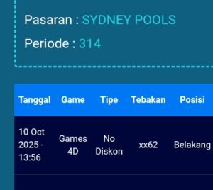 Prediksi Sydneypools Kamis, 06-11-2025 Merupakan Prediksi Otomatis yang menggabungkan Metode Kalender Togel Dengan LN Generator yang akurasi prediksinya sudah kita ketahui bersama. Jadi harap Maklum Jika kadang meleset Prediksi Sydneypools kita. Jadikan ini sebagai perbandingan saja dan tetap Utamakan karya sendiri