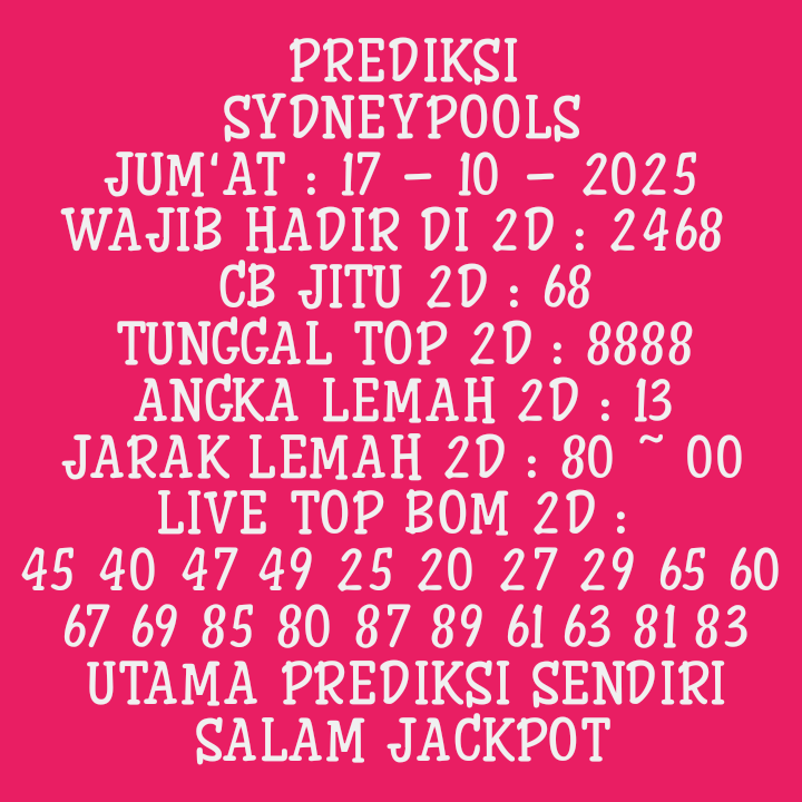 Prediksi Sydneypools Kamis, 06-11-2025 Merupakan Prediksi Otomatis yang menggabungkan Metode Kalender Togel Dengan LN Generator yang akurasi prediksinya sudah kita ketahui bersama. Jadi harap Maklum Jika kadang meleset Prediksi Sydneypools kita. Jadikan ini sebagai perbandingan saja dan tetap Utamakan karya sendiri