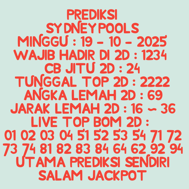 Prediksi Sydneypools Kamis, 06-11-2025 Merupakan Prediksi Otomatis yang menggabungkan Metode Kalender Togel Dengan LN Generator yang akurasi prediksinya sudah kita ketahui bersama. Jadi harap Maklum Jika kadang meleset Prediksi Sydneypools kita. Jadikan ini sebagai perbandingan saja dan tetap Utamakan karya sendiri