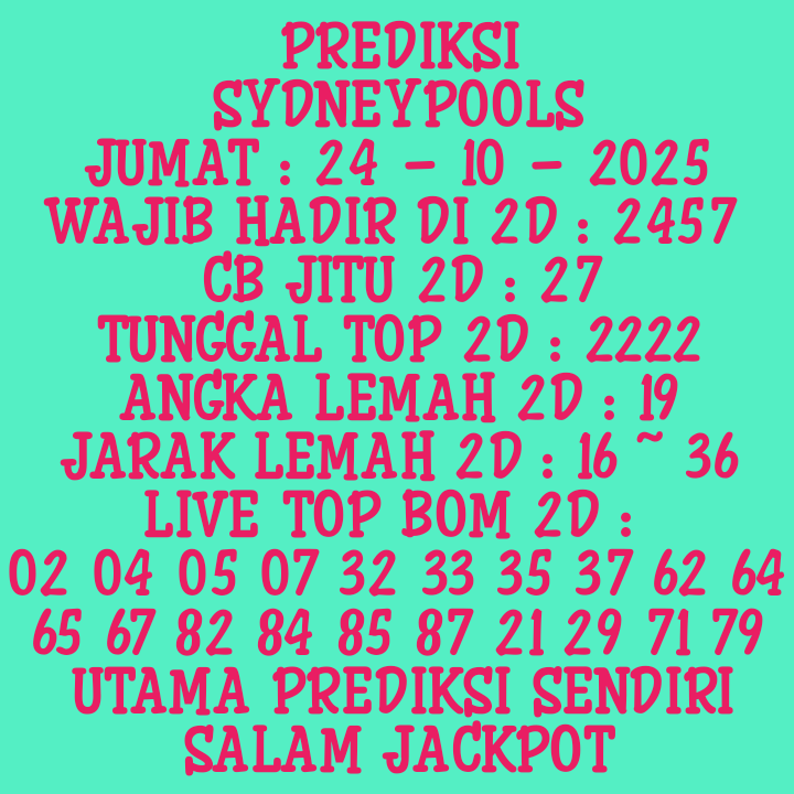 Prediksi Sydneypools Kamis, 06-11-2025 Merupakan Prediksi Otomatis yang menggabungkan Metode Kalender Togel Dengan LN Generator yang akurasi prediksinya sudah kita ketahui bersama. Jadi harap Maklum Jika kadang meleset Prediksi Sydneypools kita. Jadikan ini sebagai perbandingan saja dan tetap Utamakan karya sendiri