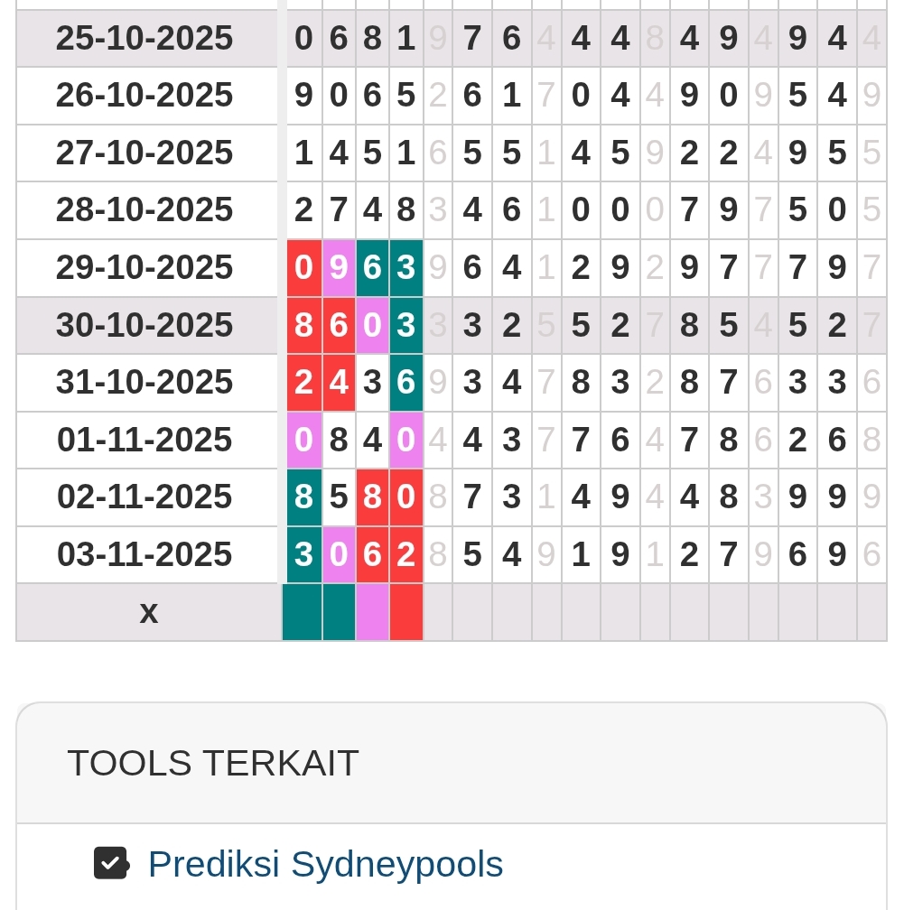 Prediksi Sydneypools Rabu, 05-11-2025 Merupakan Prediksi Otomatis yang menggabungkan Metode Kalender Togel Dengan LN Generator yang akurasi prediksinya sudah kita ketahui bersama. Jadi harap Maklum Jika kadang meleset Prediksi Sydneypools kita. Jadikan ini sebagai perbandingan saja dan tetap Utamakan karya sendiri