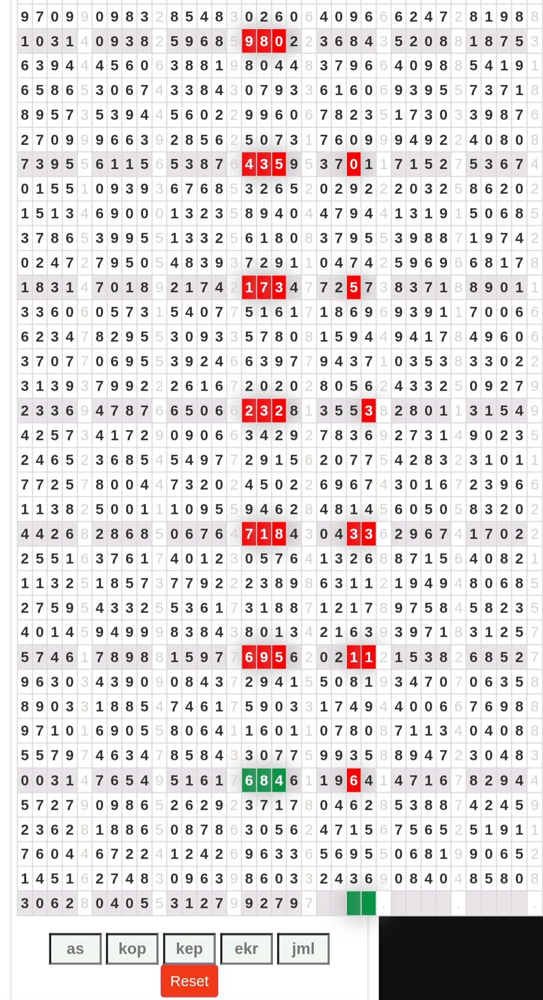 | Rumus Angka Mati berdasarkan kepala harian | 04 05 06 07 08 09 10 15 16 17 18 21 26 28 29 30 31 32 41 42 43 52 53 54 64 65 72 73 75 76 83 84 86 93 94 95 96 97 98 |