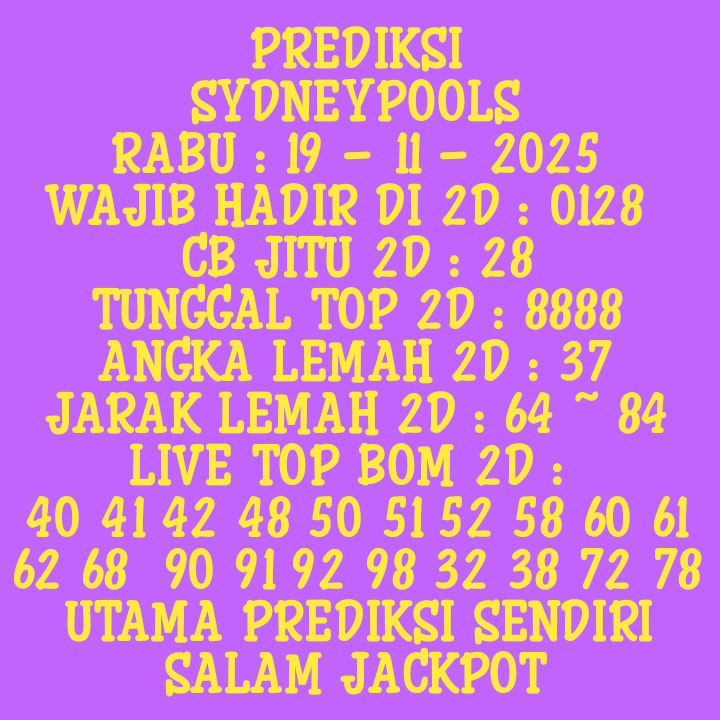 Prediksi Sydneypools Jumat, 21-11-2025 Merupakan Prediksi Otomatis yang menggabungkan Metode Kalender Togel Dengan LN Generator yang akurasi prediksinya sudah kita ketahui bersama. Jadi harap Maklum Jika kadang meleset Prediksi Sydneypools kita. Jadikan ini sebagai perbandingan saja dan tetap Utamakan karya sendiri