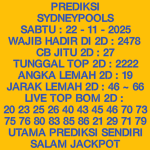 Prediksi Sydneypools Sabtu, 22-11-2025 Merupakan Prediksi Otomatis yang menggabungkan Metode Kalender Togel Dengan LN Generator yang akurasi prediksinya sudah kita ketahui bersama. Jadi harap Maklum Jika kadang meleset Prediksi Sydneypools kita. Jadikan ini sebagai perbandingan saja dan tetap Utamakan karya sendiri