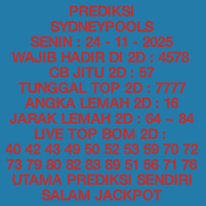 Prediksi Sydneypools Rabu, 26-11-2025 Merupakan Prediksi Otomatis yang menggabungkan Metode Kalender Togel Dengan LN Generator yang akurasi prediksinya sudah kita ketahui bersama. Jadi harap Maklum Jika kadang meleset Prediksi Sydneypools kita. Jadikan ini sebagai perbandingan saja dan tetap Utamakan karya sendiri