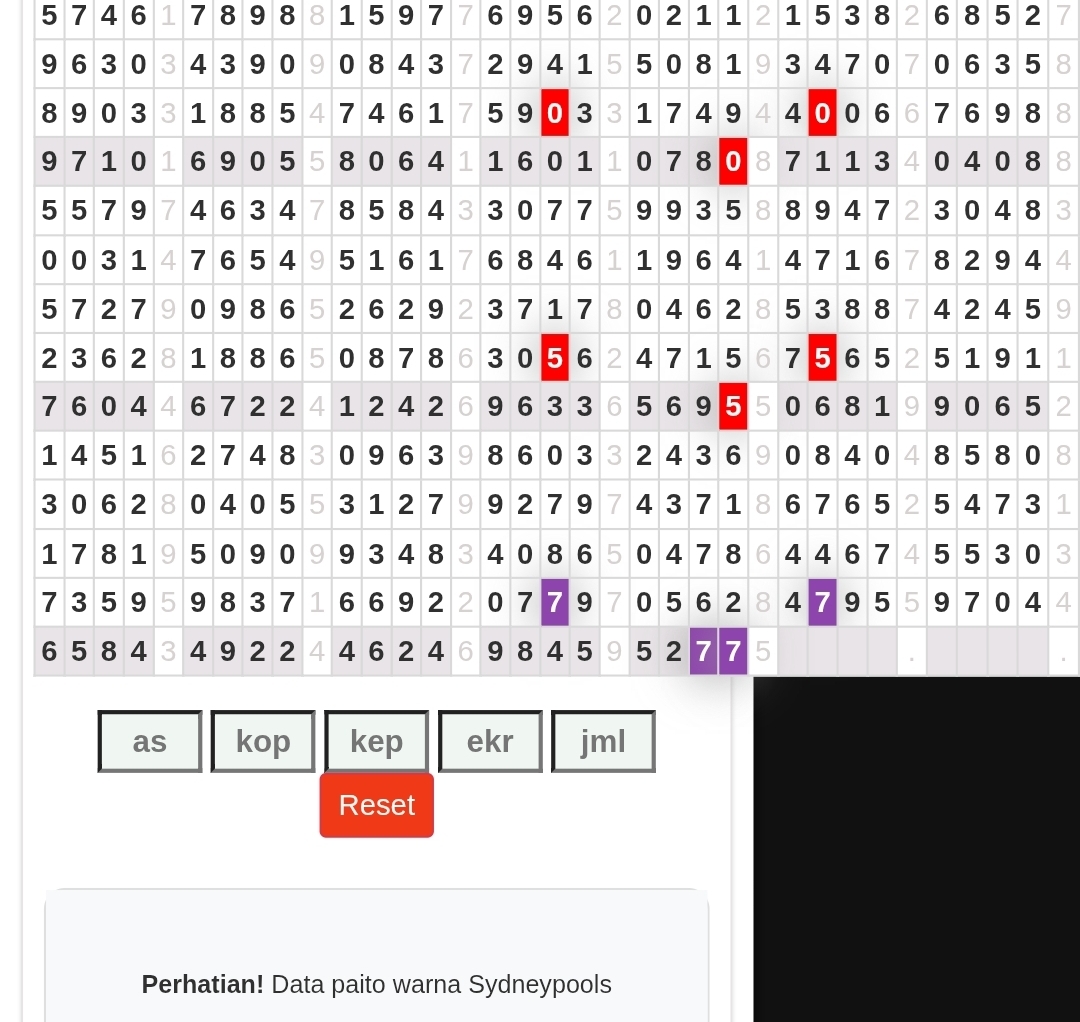 | Rumus Angka Mati berdasarkan kepala harian | 04 05 06 07 09 10 15 17 18 20 21 29 30 31 32 41 42 43 53 54 61 62 64 65 72 73 75 82 83 84 85 86 87 93 94 95 96 97 98 |