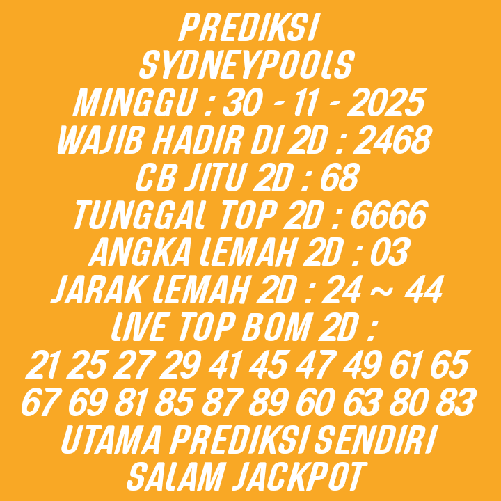 Prediksi Sydneypools Senin, 03-11-2025 Merupakan Prediksi Otomatis yang menggabungkan Metode Kalender Togel Dengan LN Generator yang akurasi prediksinya sudah kita ketahui bersama. Jadi harap Maklum Jika kadang meleset Prediksi Sydneypools kita. Jadikan ini sebagai perbandingan saja dan tetap Utamakan karya sendiri
