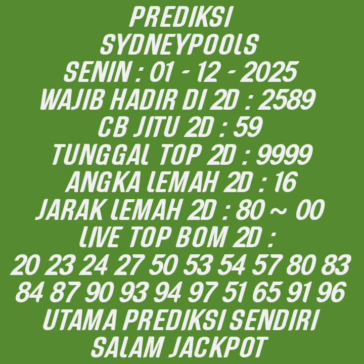 Prediksi Sydneypools Senin, 01-12-2025 Merupakan Prediksi Otomatis yang menggabungkan Metode Kalender Togel Dengan LN Generator yang akurasi prediksinya sudah kita ketahui bersama. Jadi harap Maklum Jika kadang meleset Prediksi Sydneypools kita. Jadikan ini sebagai perbandingan saja dan tetap Utamakan karya sendiri