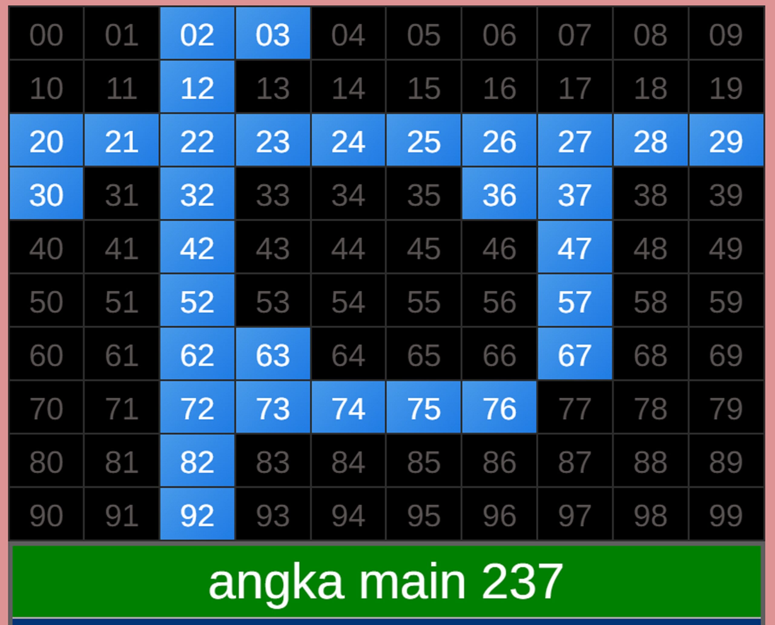| Rumus Angka Mati berdasarkan kepala harian | 04 05 06 07 09 10 15 17 18 20 21 29 30 31 32 41 42 43 53 54 61 62 64 65 72 73 75 82 83 84 85 86 87 93 94 95 96 97 98 |