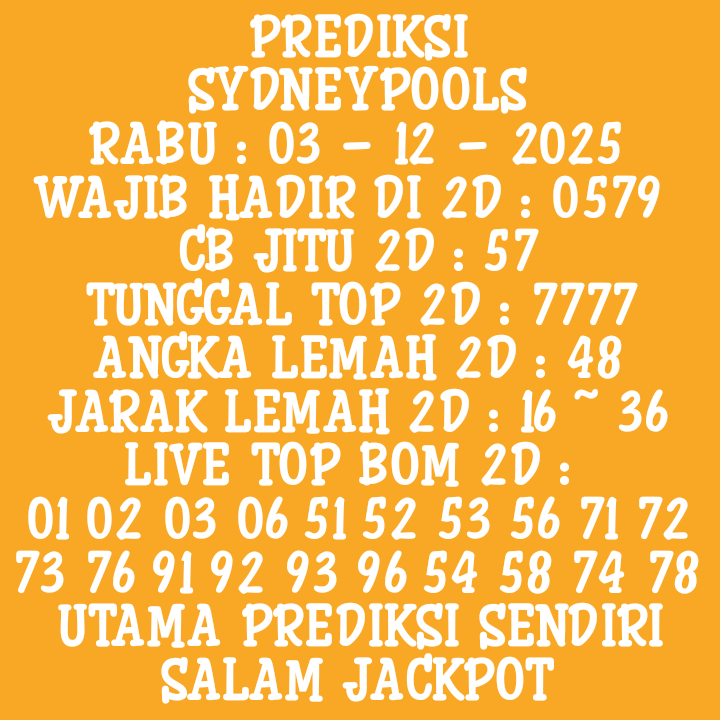Prediksi Sydneypools Rabu, 05-11-2025 Merupakan Prediksi Otomatis yang menggabungkan Metode Kalender Togel Dengan LN Generator yang akurasi prediksinya sudah kita ketahui bersama. Jadi harap Maklum Jika kadang meleset Prediksi Sydneypools kita. Jadikan ini sebagai perbandingan saja dan tetap Utamakan karya sendiri